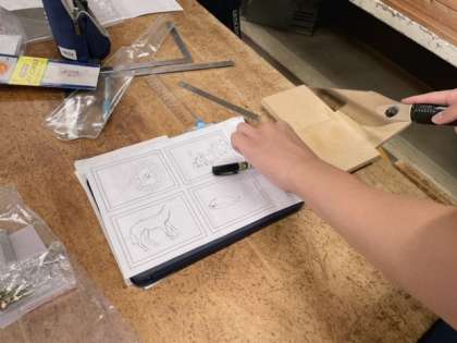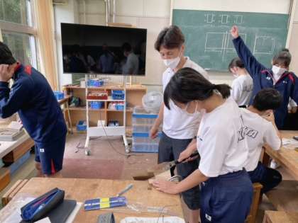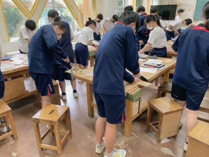 3年生は鋳造の技術を学びオリジナルのキーホルダーを作成します。型を固定する枠を両刃のこぎりで切断しています。