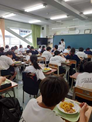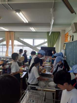 1年D、E、F組の給食配膳の様子です。食べ始めているクラスもあります。
