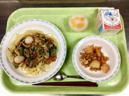 今日は五目あんかけそばです。あんかけの中に、肉・いか・うずら卵・そしてたくさんの野菜が入っています。麺に絡めて食べて、たくさん栄養をとってください!また、今日は暑くなると予想して、いつもより生姜の量を増やしています。生姜などの香味野菜は、食欲増進の効果があります。
