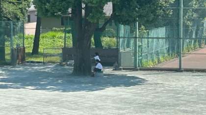 今日は熱中症警戒のため、ボール貸し出しがなく、ほとんど校舎内で過ごしています。数人は日陰で風を感じながら休んでいます。先生たちが見守っています。