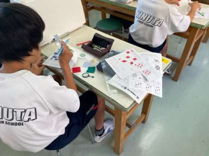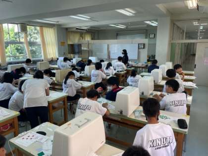 織物について勉強中です。布片をルーペで観察して繊維の方向を調べています。