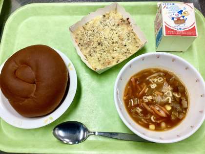 今日はパン、グラタン、スープです!給食のグラタンには大きく分けて2種類あります。ホワイトソースで作る物、そしてトマトベースのミートソースで作る物です。今日はホワイトソースとチーズたっぷりのまろやかなグラタンなので、スープは「トマトの酸味とコク」をしっかり感じる「ABCミネストローネ」にしました!