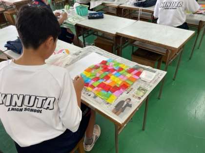 起きあがりこぼしが完成した人は、次に名画「風神雷神」に挑戦です。下地となるお花紙づくりの色合いにに思案中です。