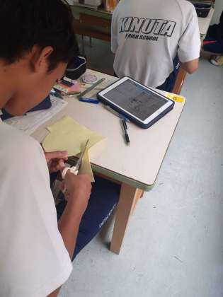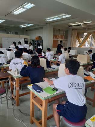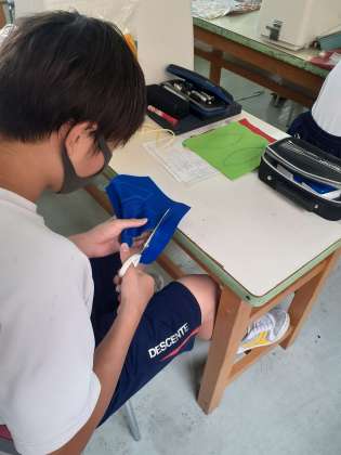 三年生の家庭科では、フェルトを使って、おもちゃ作りをしています。どんなおもちゃを作るか決めて、裁断をしています。