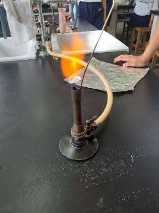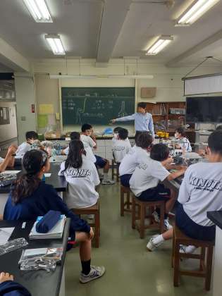 今日の一年生の理科の授業は、実験です。白い粉(塩、砂糖、片栗粉)の正体を火で加熱して調べます。安全第一に班で協力して行っています。