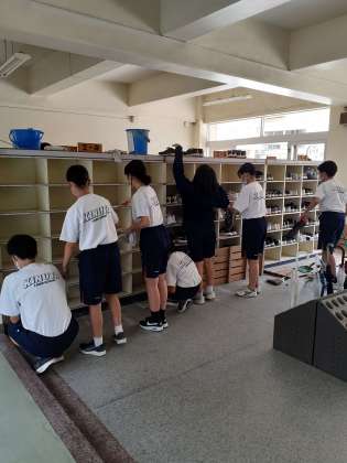 今日の5時間目は美化デーです。まず、教室の机、椅子を廊下に出して、心を込めて掃除します。特別教室や昇降口など、担当に分かれて綺麗にしていきます。