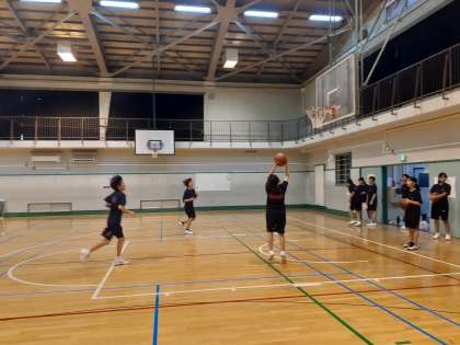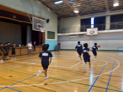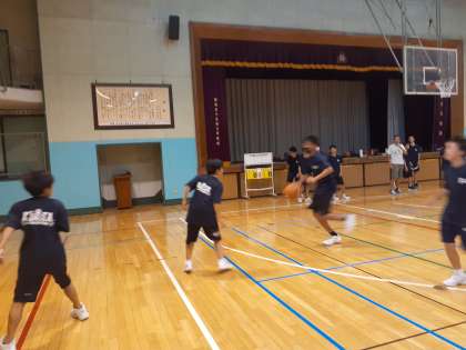 体育館では男女バスケット部が練習をしています。女子はスリーメン、男子は2対2の練習中です。