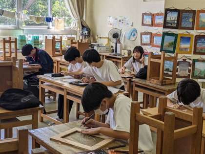 3年生が額縁の彫刻に一生懸命取り組んでいます。