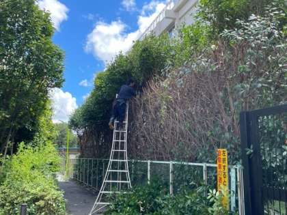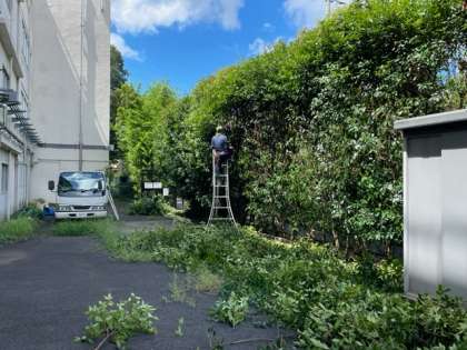 2学期に向けて北側通学路の植栽を剪定しています。通学路に大きく覆い被さってしまい登下校の妨げ、そして視界が悪く不審者等の安全面も心配されましたがこれで安心です。