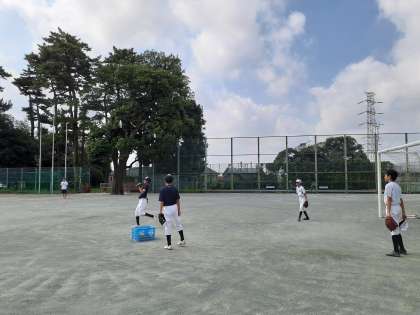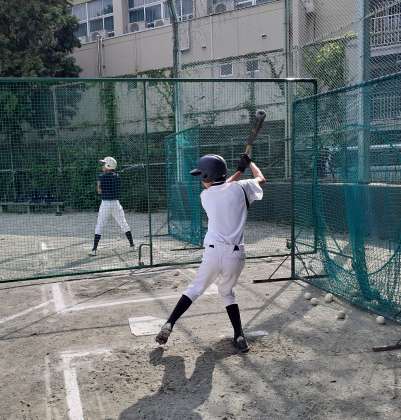 朝7時半からグラウンドでは、野球部が練習しています。ピッチング、バッティング、外野守備の練習の様子です。