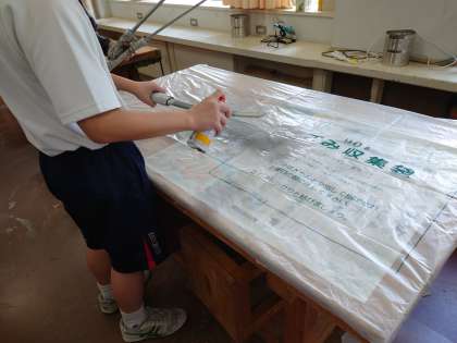演劇部では、小道具に着色をするなどの作業を行っています。