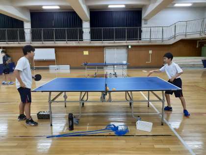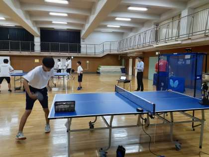午前中、格技室では卓球部の練習が行われています。全中の試合の様子を見て勉強しているところです。その後の休憩時間には、各々が練習していました。