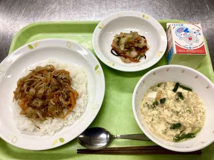 今日のこだわりは、プルコギ丼の手作りタレ!すりおろした玉ねぎ・りんご・生姜・にんにくに醤油・砂糖・みりん・塩・ごま油・白ごまを加えてじっくり煮詰めています。豚肉と玉ねぎ・人参・もやしを炒めた後で、タレを加えれば完成です!白ごはんにとってもよく合い、「丼」として美味しさに一体感のある仕上がりになっています。これまでのお休みの人数も考慮して、お米は予定よりも1kg減らして実施しました。