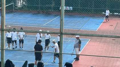 台風のあと、テニス部がコートの水取りをしてから練習しています。