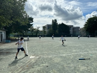 三年生男子の体育はソフトボールです。クラスを2つのチームに分けて試合をしています。