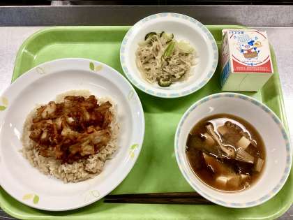 1年生がいないこともあって、今日は大変手間がかかりますが人気メニューである「かき揚げ天丼」にしました。かつお節でとった「だし汁」に醤油・みりん・三温糖・水溶き片栗粉で作ったタレを、ご飯とかき揚げ両方にかけます。かき揚げだけだと、「丼」として味がしっかりつかないので、ご飯にもタレをかけてもらっています。大変ですが、ありがたいことに砧中の「かき揚げ天丼」は、いつも調理員さんが丁寧にかけてくれています。