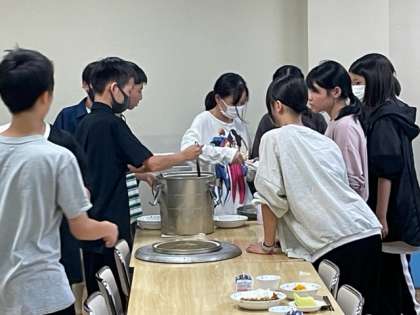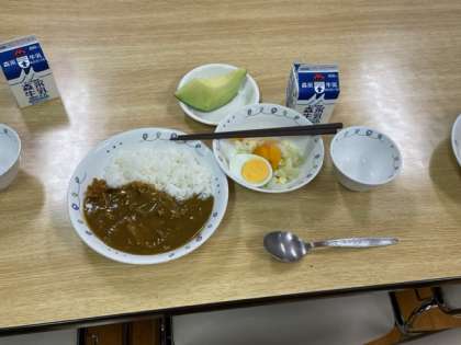 給食準備で慣れているのか、手際良くカレーの盛り付けをしています。