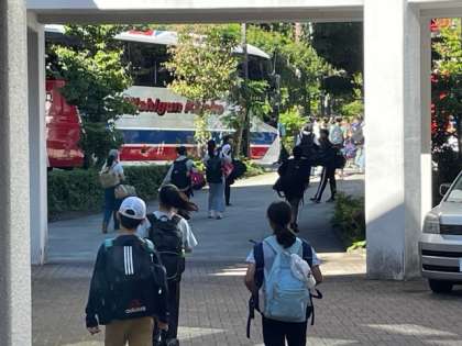 湖畔で集合写真を撮り、部屋の清掃も終わりバスに乗り込みます。