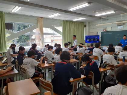 今日の英語の授業では、ICT教育の一環として、ICTサポーターの先生と一緒にIPadを使った授業を行っています。
