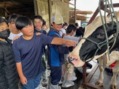 乳搾りを待っている間に牛と仲良くなり顔を撫でたりしています。
