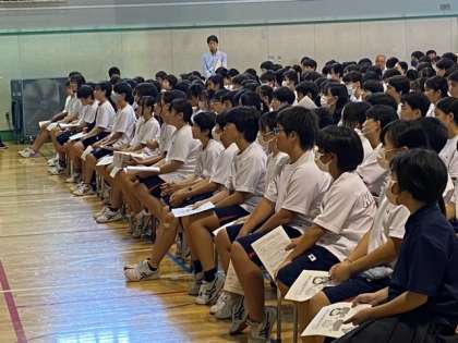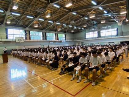 暑い中ですが、立候補者の演説を真剣に聞いています。この演説後、各クラスにて投票を行います。