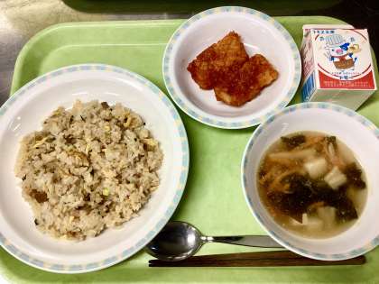 わかめスープは、鶏ガラスープをもとに人参・たけのこ・わかめ・豆腐・白ごまを加えてすっきり飲めるようにしています。入っている具によって不足しがちな栄養を補うことができるので、給食全体の栄養バランスをさらに高めてくれています。最近スープの残りが本当に少なくなったので嬉しいです!今日もぜひ、バランスよく食べてください!