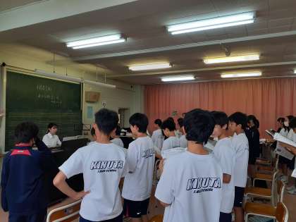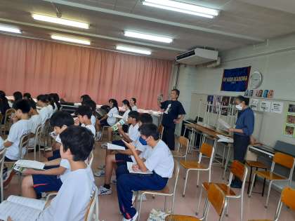 1年生の音楽では、9月1ヶ月間実習に来てくださっている佐野先生の研究授業がありました。合唱コンクールの学年曲とクラス曲の練習をしています。