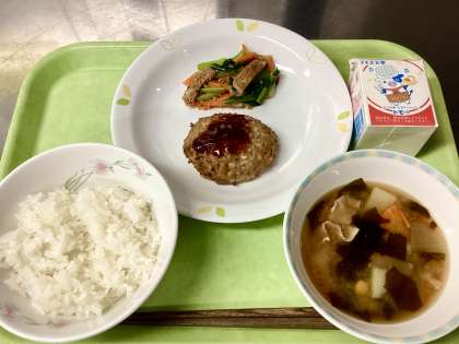 今日はイワシのすり身を使ったハンバーグです!給食では1回の肉の摂取基準量が24gまでと非常に厳しいので、肉の使用量を節約しつつ、美味しくできる料理が求められます。今日のイワシハンバーグは、肉を減らしつつ魚の摂取量も確保でき、ハンバーグとしても美味しく食べられる優れたメニューです。