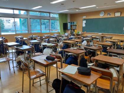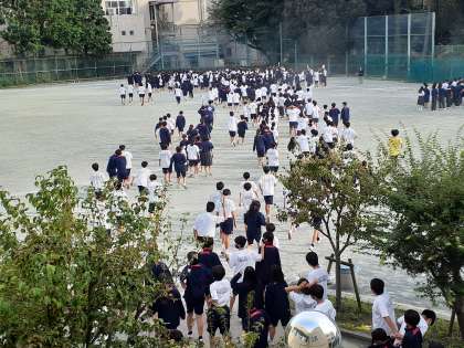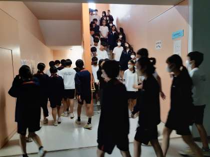 今日の六時間目に避難訓練がありました。地震が発生した場合の訓練です。指示に従って素早く避難しています。