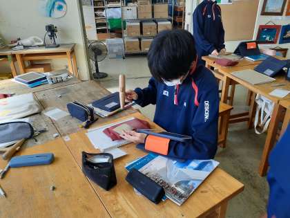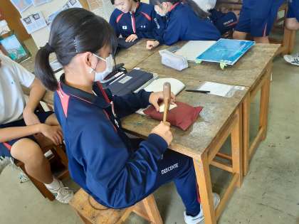 次に、「錫に思いをのせて」という題で錫を使った作品を制作します。デザインが決まった人から、錫の板を叩いて、形にしていきます。