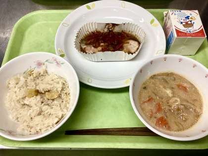 今日は秋の味覚「栗ご飯」と、北海道の郷土料理「鮭のチャンチャン焼き」と、栄養たっぷりの「呉汁」です!