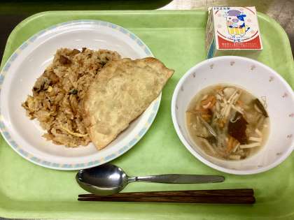 今日の給食は、キムチチャーハンです!ラードと醤油・塩を入れて炊き上げた中華風味のご飯と、キムチや豚肉などの具を炒め合わせます。作り方は、本格中華そのもの!給食用の釜を「巨大な中華鍋」に見立てて、油の中に大量の溶き卵を加え、半熟になる前に大量のご飯を入れて炒め合わせます。卵が固まる前に全体が馴染むように、体力とスピードがものを言う作業です。そして恐ろしいのが、この工程を全クラス分、何回も繰り返さなくてはならないことです。今日は2年生がいないとはいえ、本当にいつもありがとうございます調理員さん!