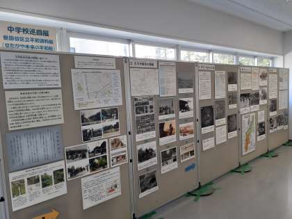 10月12日より19日まで職員室横の廊下にて、世田谷区平和資料館中学校巡回展を展示しています。昼休みに展示を見に来ている生徒の姿が見られました。パネル展示とショーケースの展示があります。是非皆さんご覧ください。