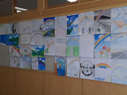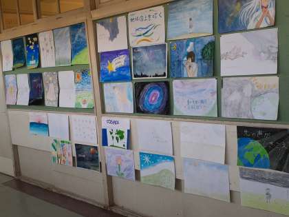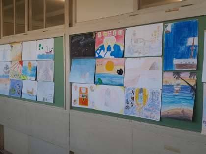 各クラス前の掲示板では、合唱コンクールで歌う課題曲やクラスの曲のイメージポスターを掲示しています。