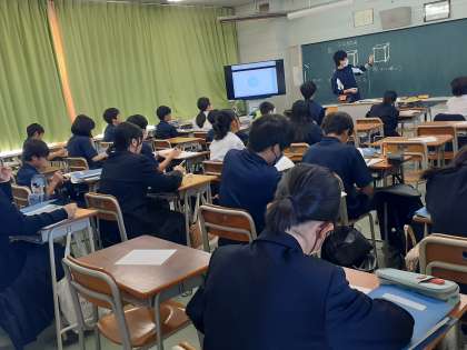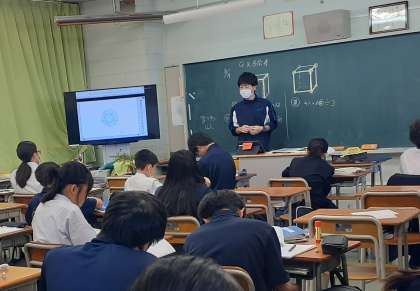 1年生の数学の授業の様子です。図形の単元ではモニターと黒板を併用して授業を進めています。