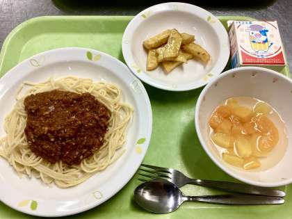 ミートソースの中には、玉ねぎやセロリ・人参などの野菜のみじん切りや大豆のみじん切りがけっこう入っているので、実は栄養たっぷりなんです。なので、今日はたくさん食べてください!