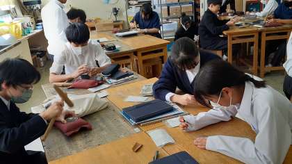 2年生の美術は錫に思いをのせて、作品作りをしています。思い思いに錫を切って叩いて形にしていきます。
