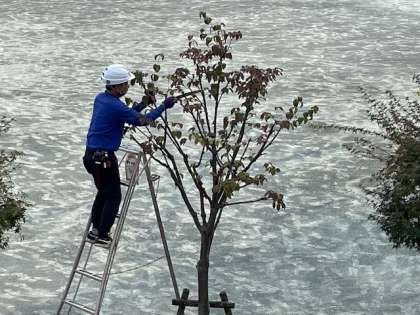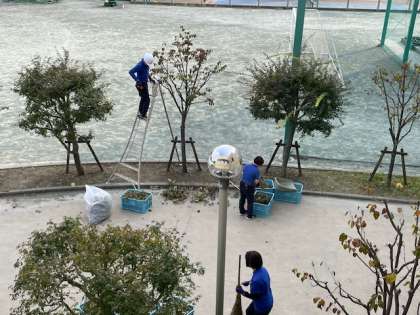 正門からの通路の樹木をソシオさんが剪定してくれています。10月28日の学芸発表会のメインゲートとなる通路を整えて保護者の皆様を気持ちよく迎えようと頑張ってくれています。