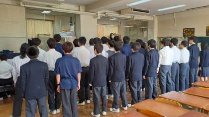 I組では、明日の学芸発表会に向けて、教室を舞台に見立てて、入場から退場までの通し練習をしています。今年は伴奏も生徒が行います。