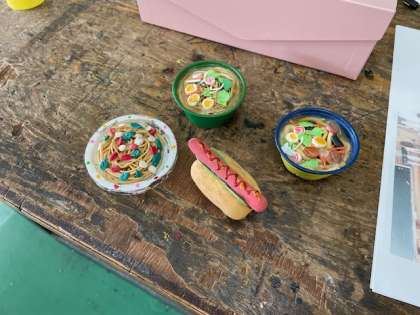 粘土でミニチュアフードを作成するので、今日はアイデアを考えています。好きな食べ物が多いので何にするか悩んでいます。