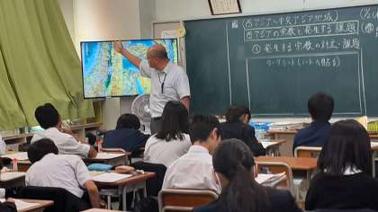 1年生の社会科では、世界の地理の西アジア.中央アジアを学習しています。モニターと黒板を併用して授業しています。