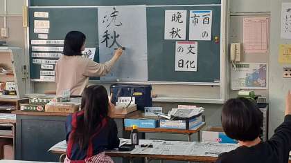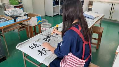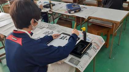 I組では、書道の授業をしています。まず、先生が黒板にお手本を書きます。その後、新聞半紙に練習して添削してもらってから、半紙に清書していきます。
