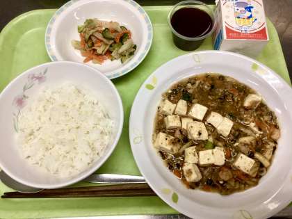今日のメインは、魚介と豆腐・豚肉と野菜もたっぷりの「豆腐とえびのうま煮」です!たくさんの食材を炒め、煮込むことにより生まれる深い味は、給食でしか出せないと思います!
