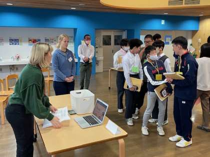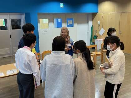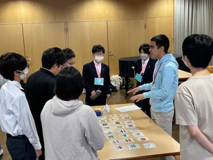グループに分かれて各ブースでゲームを通して交流が始まりました。軽快な音楽が流れるランチルームで楽しそうです!