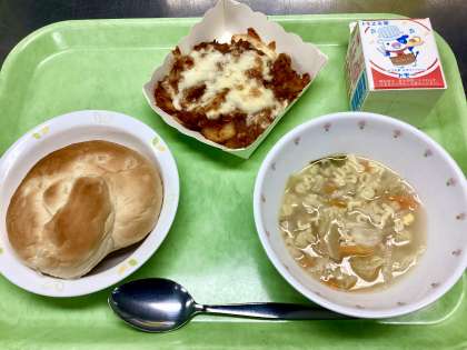 今日のグラタンは、ホワイトソースではなくてトマトを使ったミートソース系です。なので、その味に合うようにパンは少し甘めの「パインパン」、スープはシンプルに塩・こしょうで味付けした「ABCスープ」です。このスープがとても人気で、おそらく具に「見て楽しい、食べて美味しいアルファベットマカロニ」が入っているからだと思います。