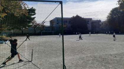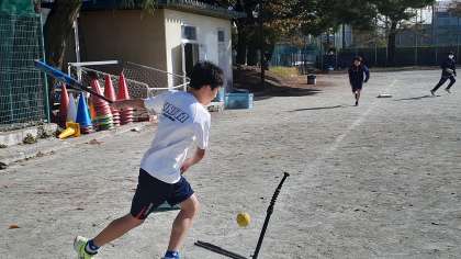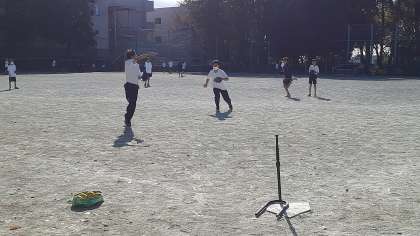 1年生の体育、男子は運動場でソフトボールをしています。投手なしで試合形式で練習しています。