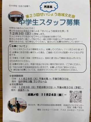 放送による生徒会朝礼を行いました。委員会活動連絡の後に、「せいじょう地域文化祭」のお知らせを青少年成城地区委員長より、地域の一員として一緒に盛り上げましょうと呼びかけがありました。