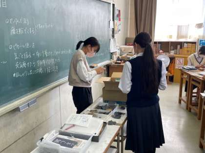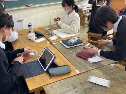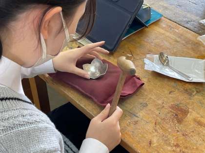2年生美術では錫をたたき、金属の展性を利用して作品を制作しています。完成後はバーチャル美術館(iPad)に展示予定ということです。