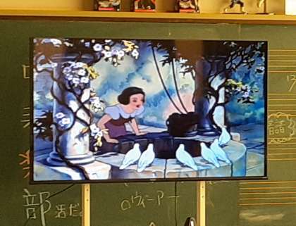 2年生の音楽では、映画鑑賞をしています。ディズニーアニメーションの「白雪姫」です。