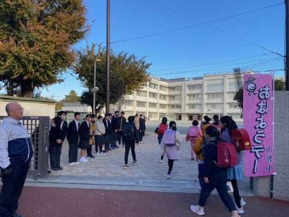 本日のあいさつ運動には中学1年生が山野小学校で活動しています。小学生も仲良しの先輩と会えて嬉しそうです。